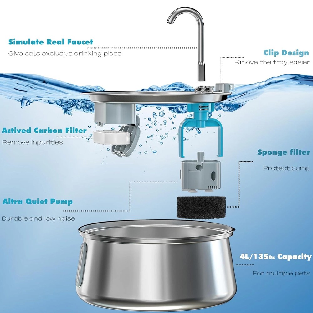 -It contains fewer small parts, which is easy to disassemble and put in the dishwasher for cleaning. The faucet simulates the faucet in the sink, which will arouse the interest of pets to drink water.