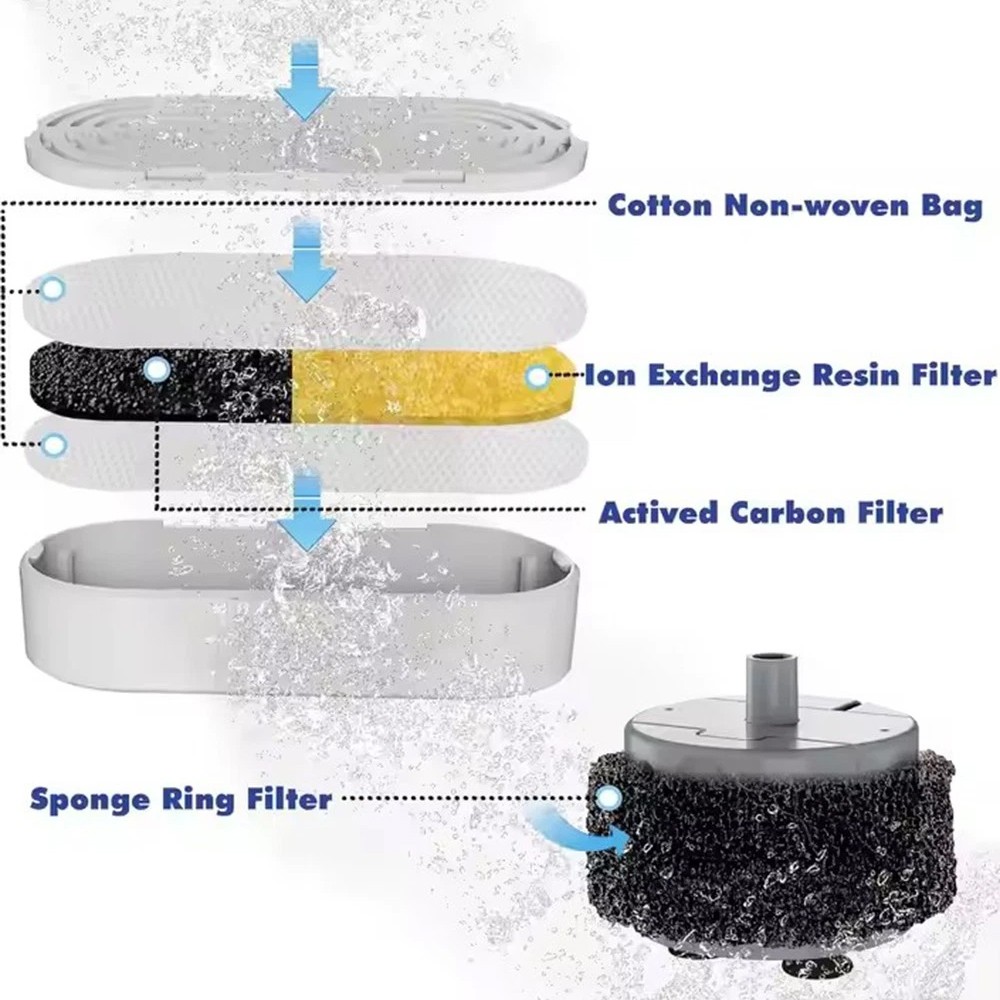 -Using a multiple filtration design, the water is first purified by the filter box net, and then enters the ion exchange resin and activated carbon filter layer. The activated carbon can remove dust and impurities in the water, and the ion exchange resin can remove calcium ions and magnesium ions in the water, which helps reduce the risk of urinary stones.