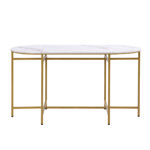 Meticulously designed six chair dining table set with white MDF table top and seat cushions and a unique gold plated iron frame, adding a touch of modern flair to your dining area.