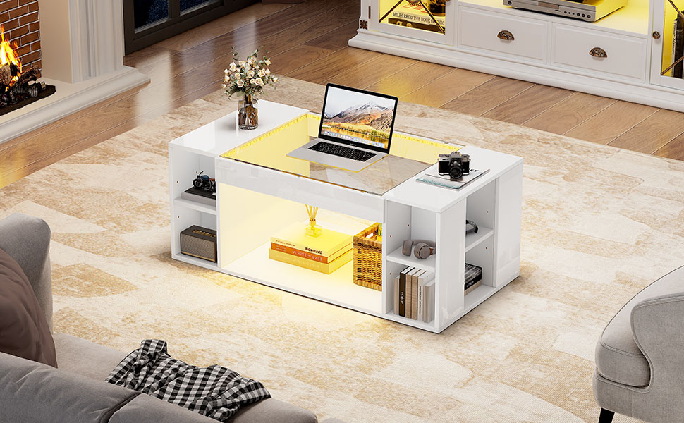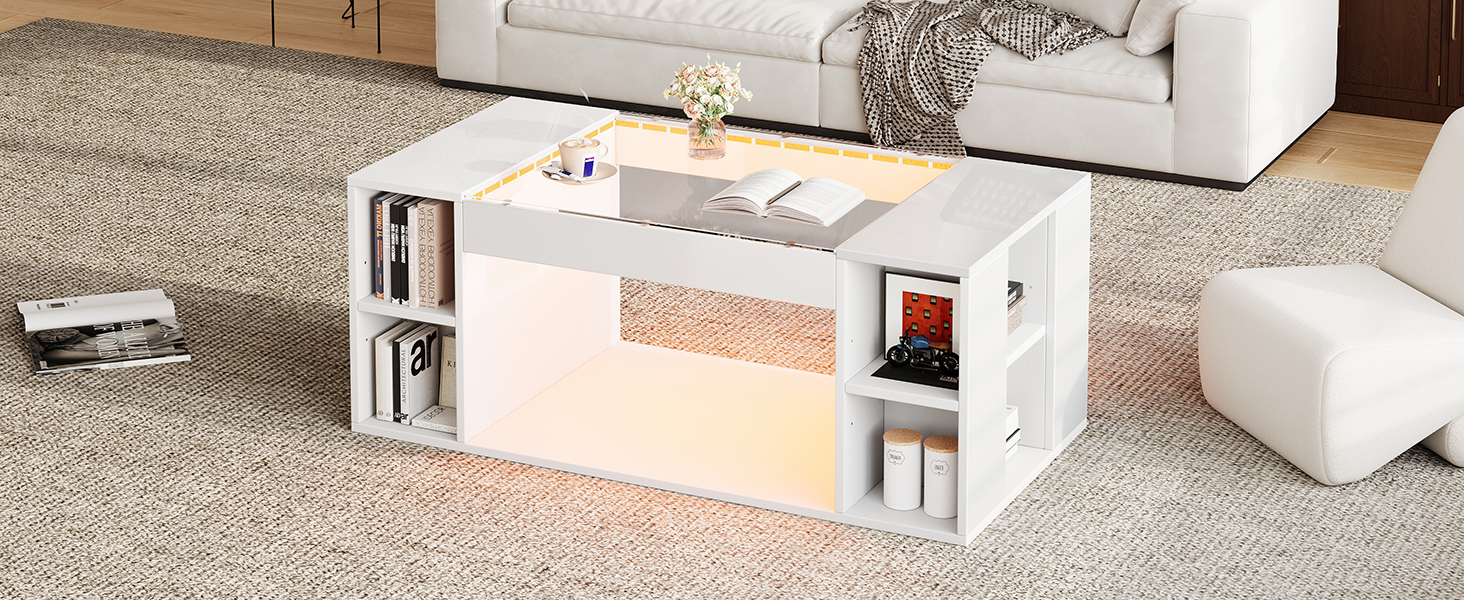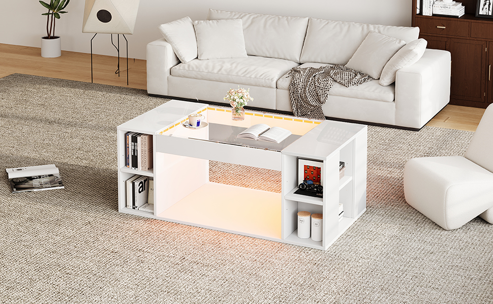 This high-gloss white coffee table combines aesthetics and practicality. Constructed with a glass tabletop and high-quality medium-density fiberboard, it’s not only smooth to the touch, wear-resistant, scratch-resistant, and easy to clean, but also sturdy, stable, and strong, resistant to deformation and cracking. It features built-in open storage space for easy organization of magazines, remote controls, and other small items, keeping your desktop clutter-free. The thoughtful LED lighting design creates a warm or stylish ambiance, enhancing the space. Its compact 100*50*40cm dimensions save space, making it suitable as a main coffee table in the living room, a side table next to the sofa, or a storage table in the office. Adaptable to various settings, its simple and versatile style easily blends into modern minimalist, light luxury, and Scandinavian decor, making it an ideal choice for enhancing the quality of your home and office spaces. 30KG load capacity. Connection and use of APP light strip: 1,iOS and Android systems can download the “LotusLantern” APP by scanning the QR code. Open the browser or other tools with “Scan QR code” function, scan the”LotusLantern” QR code(The QR code is inside the instruction manual); 2,Click on the LotusLantern APP icon, enter the APP page; 3,After entering the APP interface, if Bluetooth is not enabled, “an application wants to enable the Bluetooth function of this device.” Click [Allow] 4,With the adhesive backing, just stick the light strip to a clean, dry surface, and you can use the included tape to enhance the adhesion. Please test the led light strips before installation and install it carefully. If you have any questions during use, please contact us.