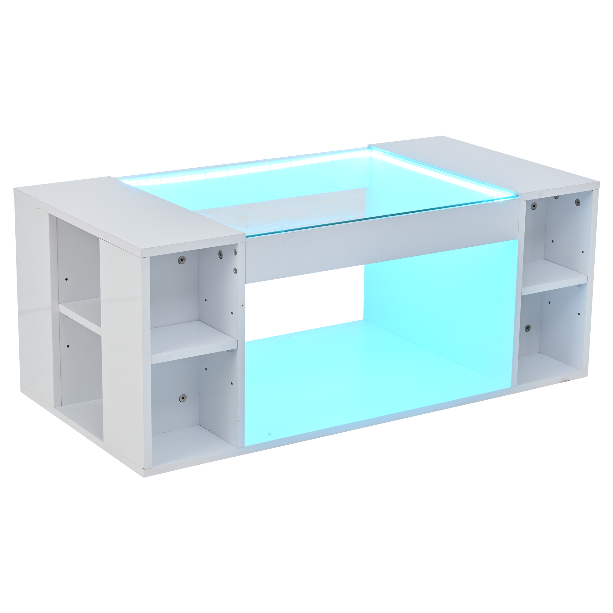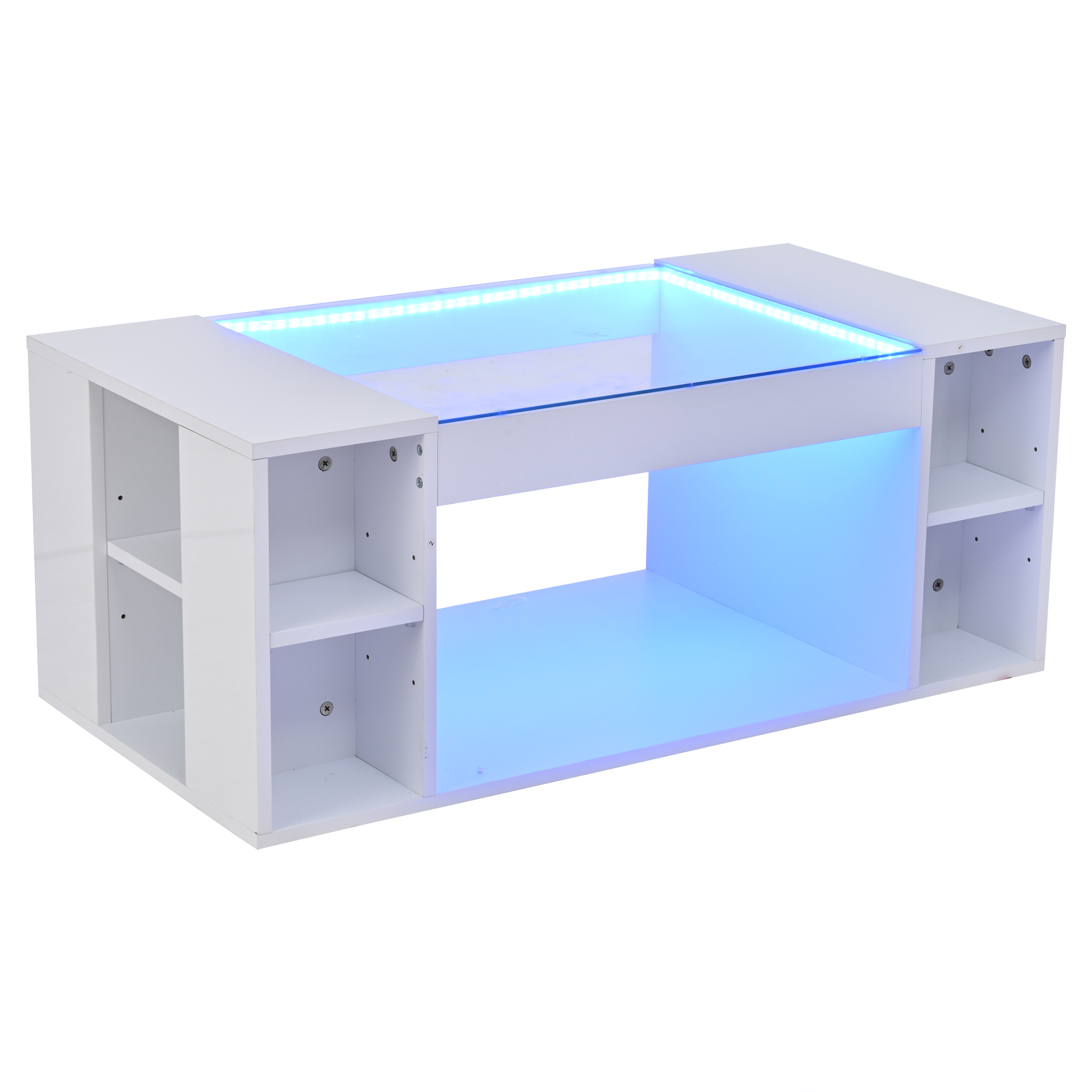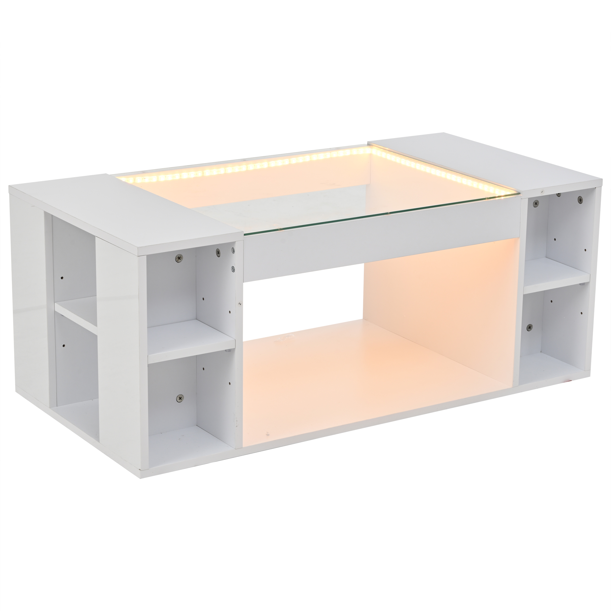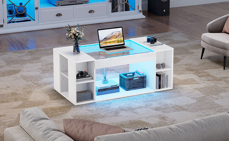 Product Name:High Gloss Coffee Table with Open Storage, LED lights, Centre Table with glass tabletop, Sofa Side Table, Coffee End Table for Living Room, Office, 100*50*40cm, White, MDF