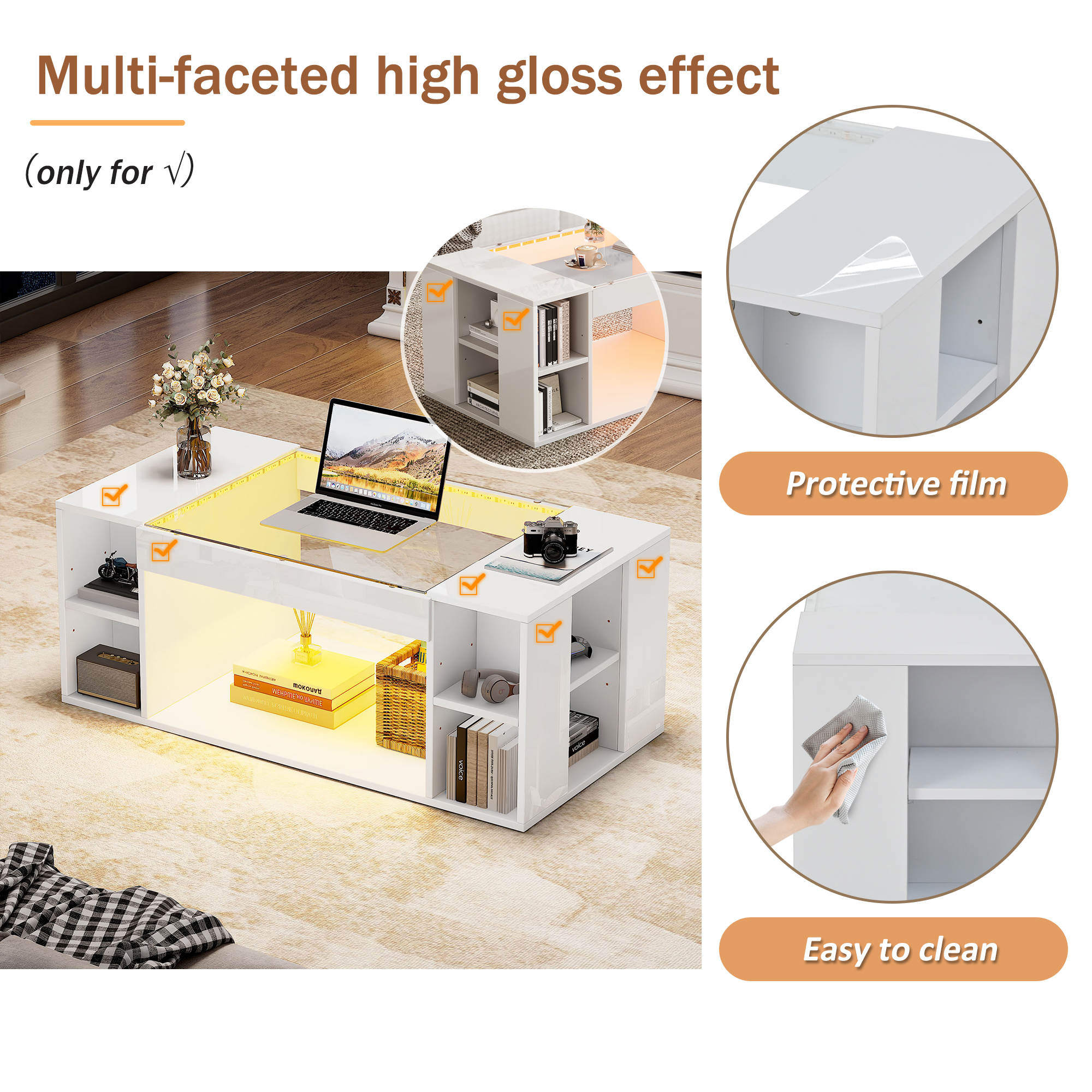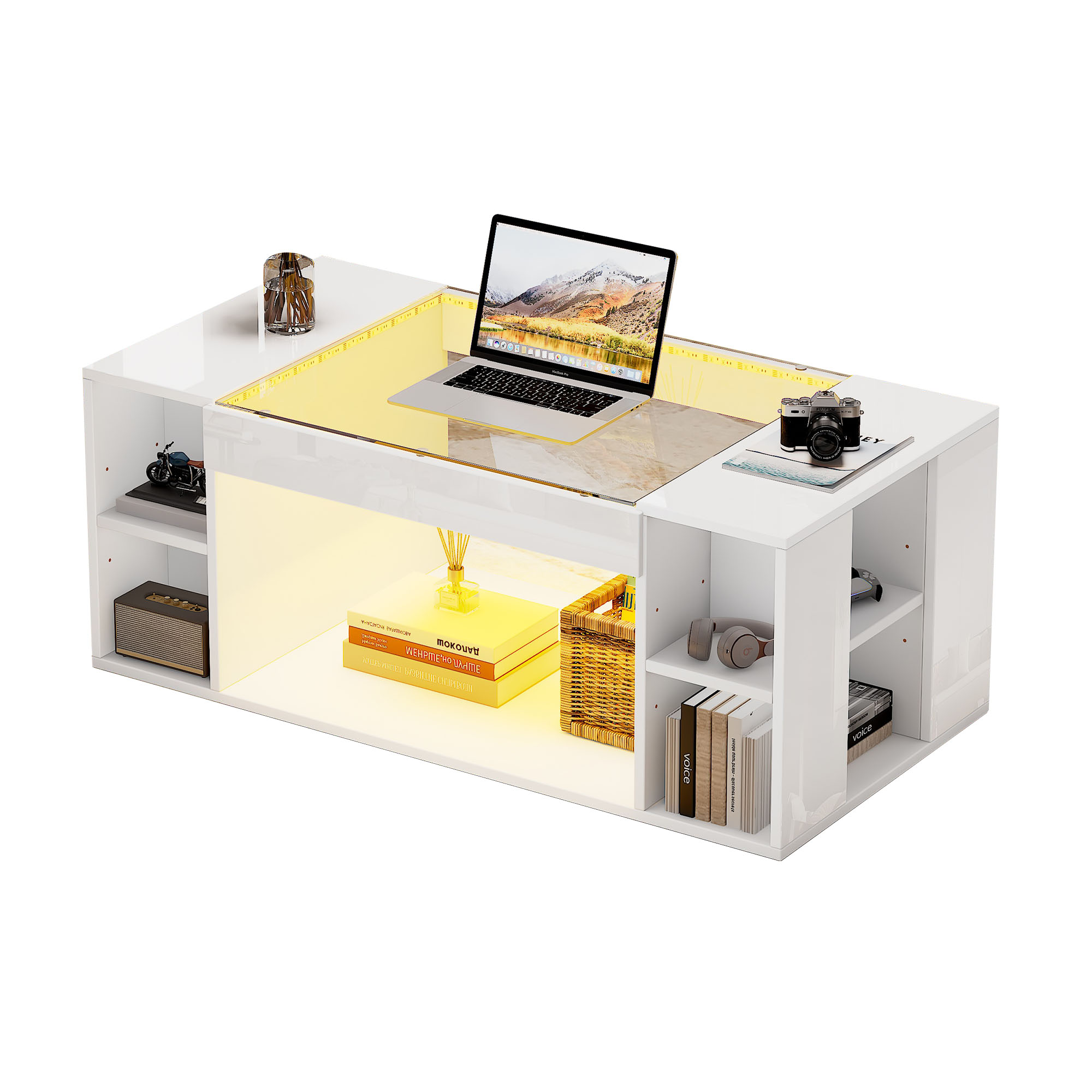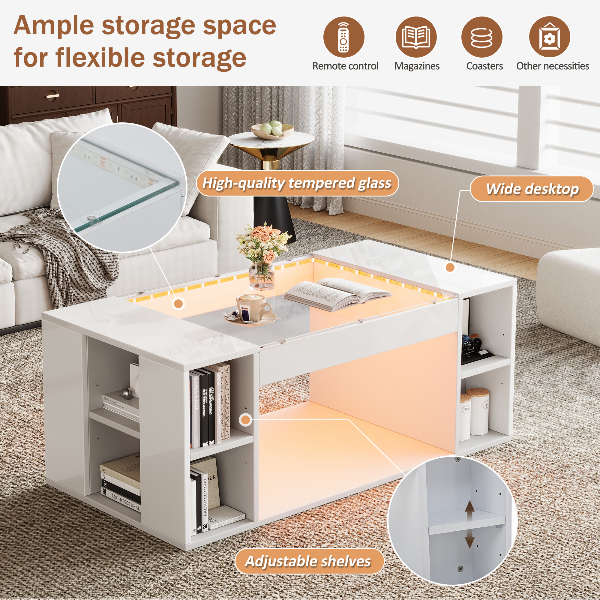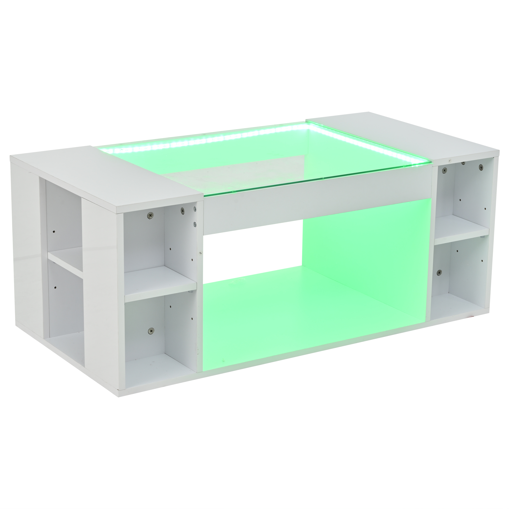 Product Name:High Gloss Coffee Table with Open Storage, LED lights, Centre Table with glass tabletop, Sofa Side Table, Coffee End Table for Living Room, Office, 100*50*40cm, White, MDF