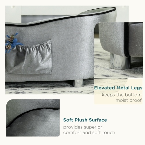 PawHut Dog Sofa Pet Chair, Kitten Bed Couch W Wooden Frame, Removable Cushion – Silver-Tone And Grey